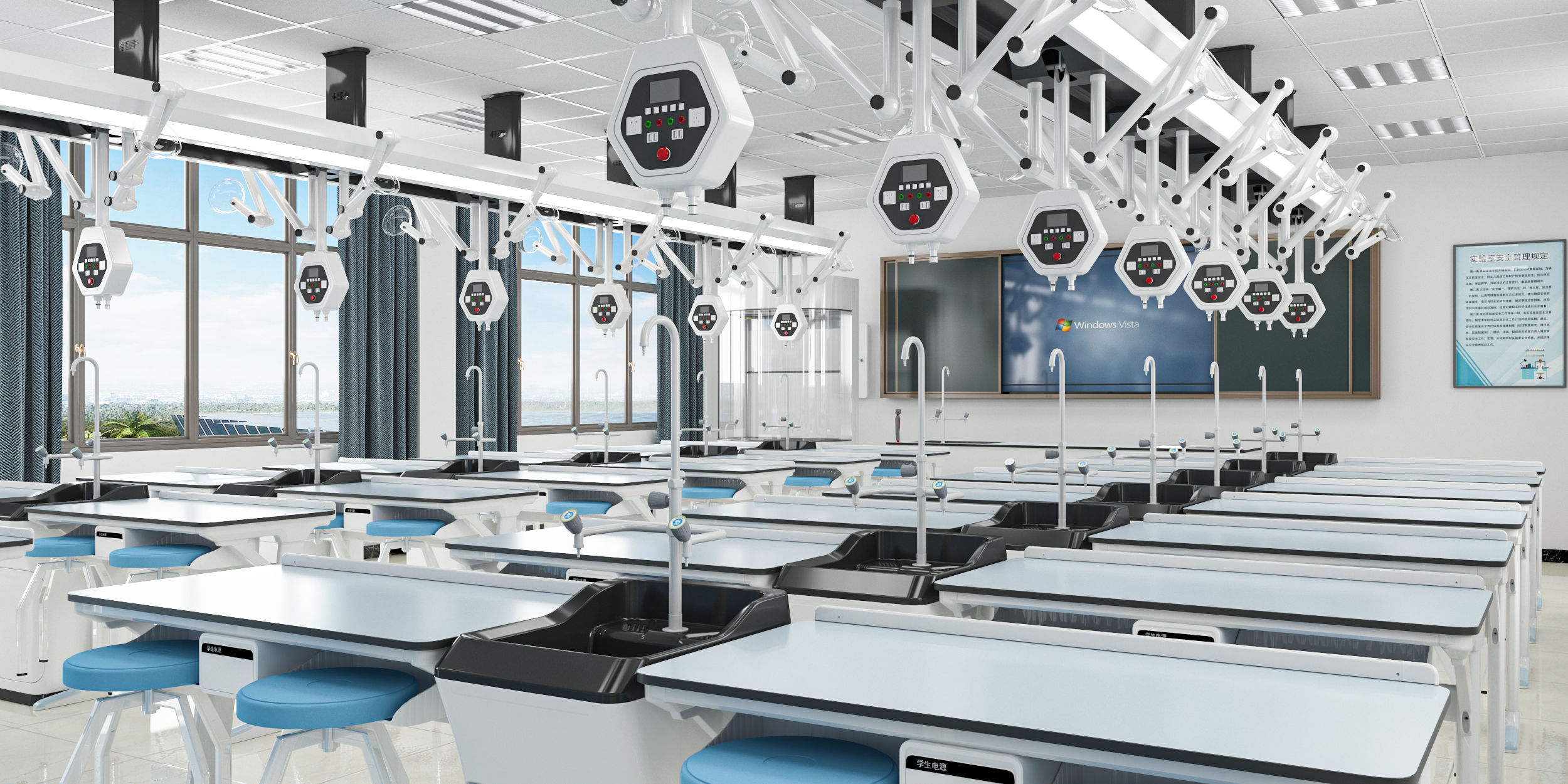 靈活擺放,將實(shí)驗(yàn)室所需要的風(fēng)、水、電、網(wǎng)絡(luò)等一體集中于頂部,節(jié)省空間的靈活布局可根據(jù)上課教育需要調(diào)節(jié),自動一體化,中央控制提高實(shí)驗(yàn)室教學(xué)效率。